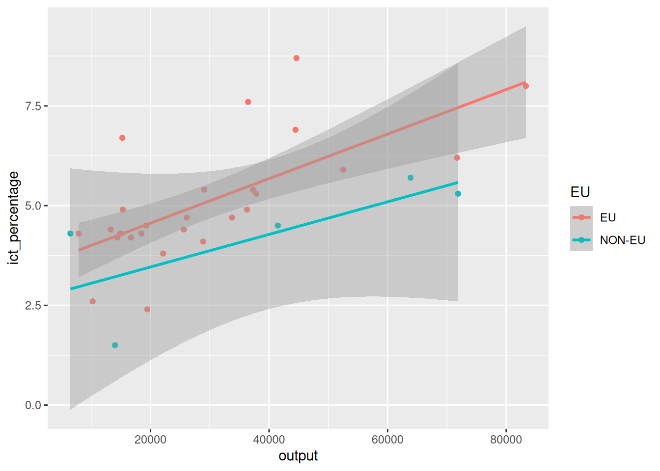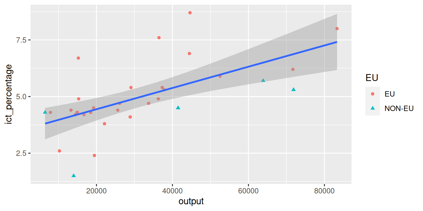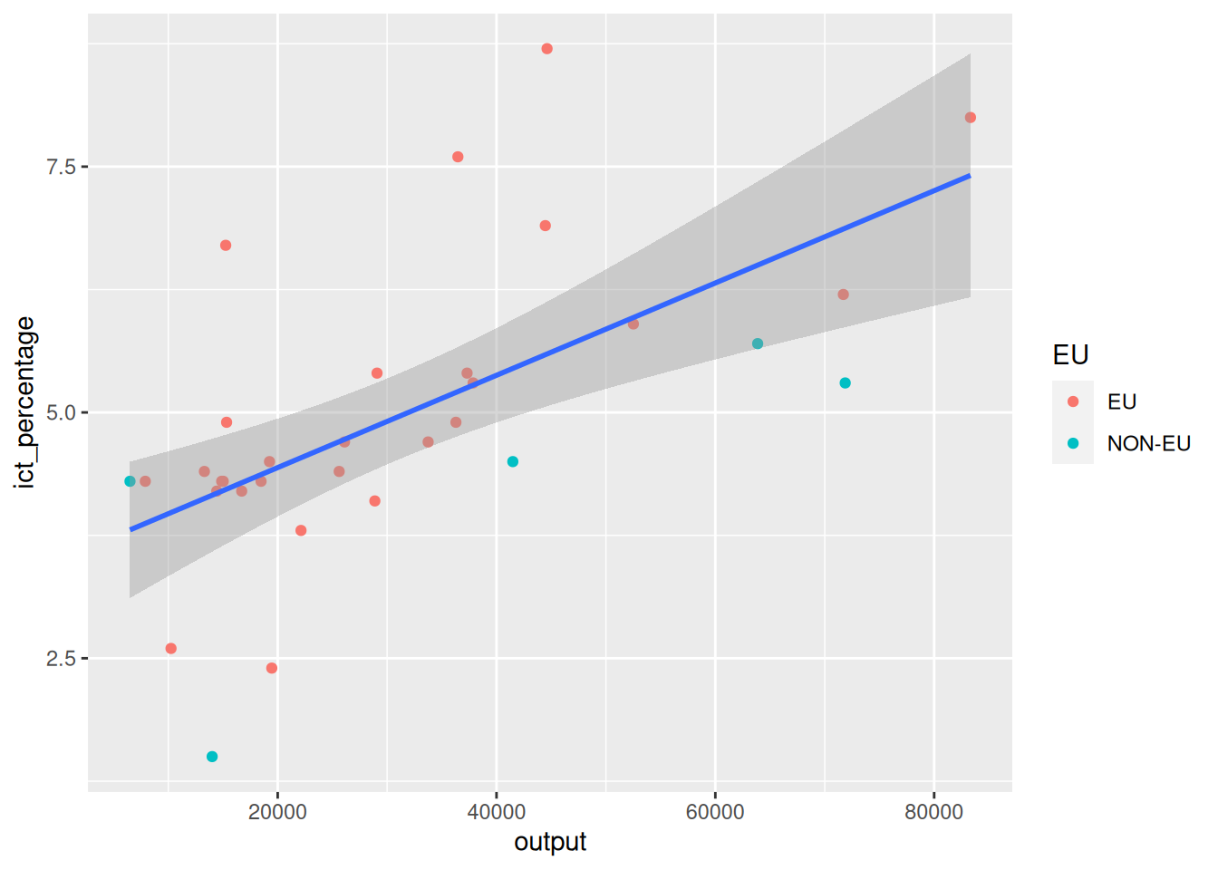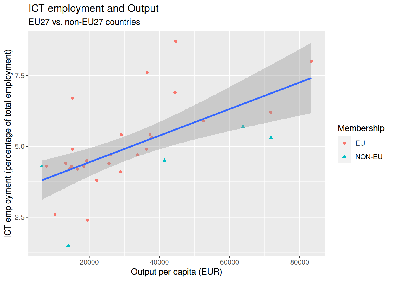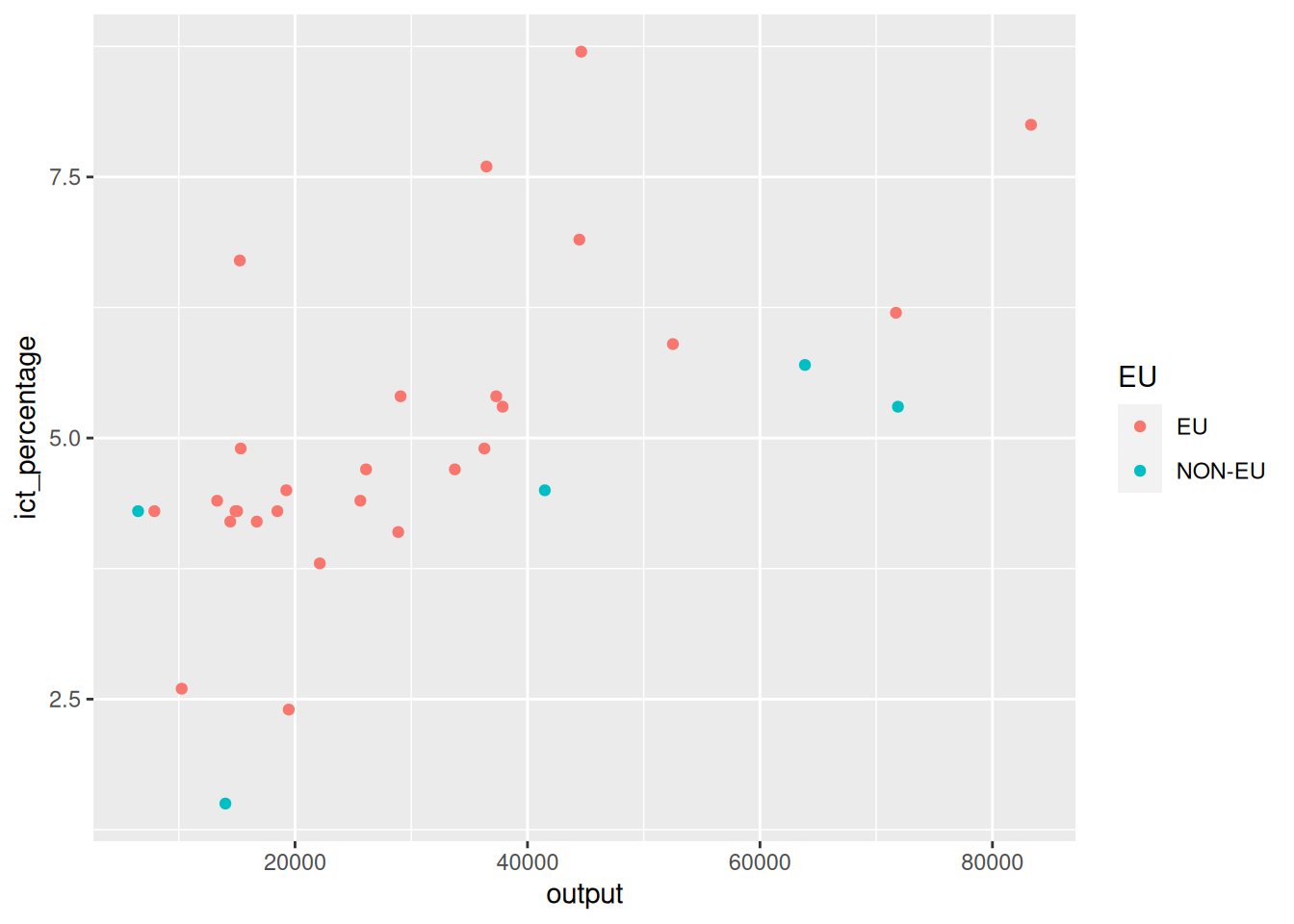 eu_ictdata frame contains GDP values and occupation percentages in the ICT sector in 32 EU and non-EU countries for the year 2023.