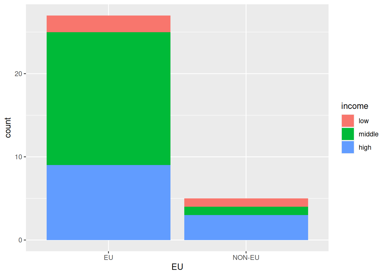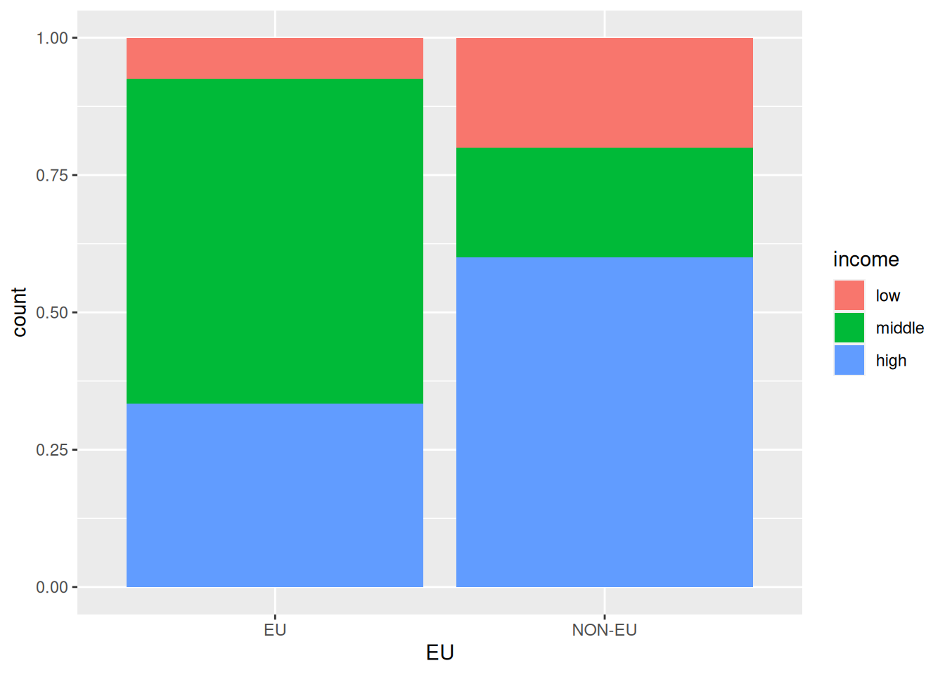 ggplot2to normalize the bar heights and color by theincomeshares within eachEUmembership category.